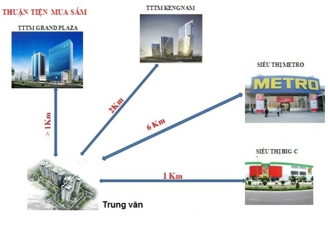- Mua Sắm và thương mại: cư dân tại Khu đô thịTrung Văn - Hancic rất thuận tiện khi mua sắm tại nhữngtrung tâm thương mại lớn ngay gần dự án gồm cósiêu thị Big C, trung tâm thương maị cao cấp Grand Plaza. Chung cư Trung Văn được thừa hưởng nhiều hệ thốngcơ sở hạ tầng được quy hoạch thông thoáng và quy mô.