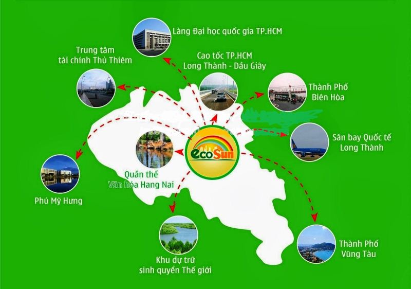 Khu Phố Eco Sun thuộc dự án Sunflower City tọa lạc tại thành phố mới Nhơn Trạch, là tâm điểm tam giác kinh tế trọng điểm TP.HCM – Đồng Nai – Vũng Tàu, tiếp giáp với Quận 2, Quận 9, Quận 7 và Nhà Bè.