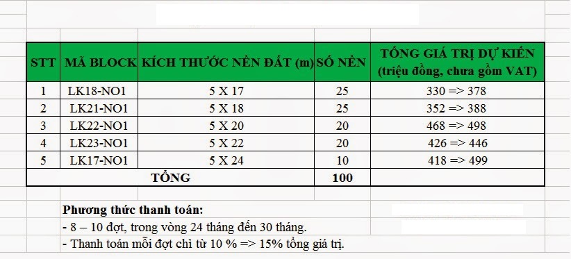 Phương thức thanh toán linh hoạt trong vòng 24-30 tháng, chia thành nhiều đợt, mỗi đợt chỉ 10-15% tổng giá trị.