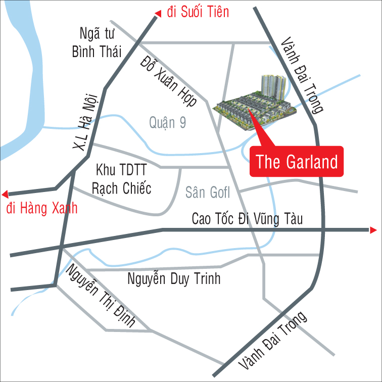 The Garland nằm bên bờ sông Rạch Chiếc tại Phường Phước Long B, Quận 9, Tp.HCM.