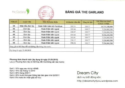 Bảng giá và phương thức thanh toán biệt thự tại dự ánThe Garland