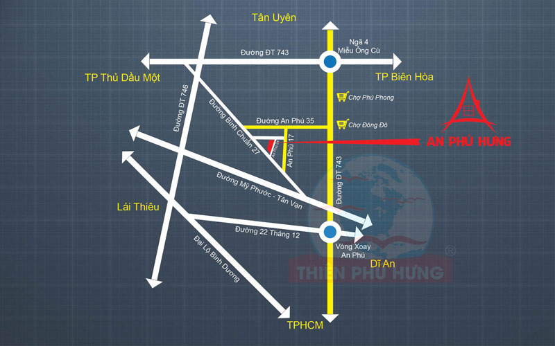 Khu dân cư An Phú Hưng do Công ty Cổ phần đầu tư xây dựng và kinh doanh Bất Động Sản Thiên Phú Hưng làm chủ đầu tư và phân phối độc quyền. Dự án được triển khai trên khu đất rộng17,030.4m2 tại Thuận An, Bình Dương với mật độ xây dựng khoảng 80%.
