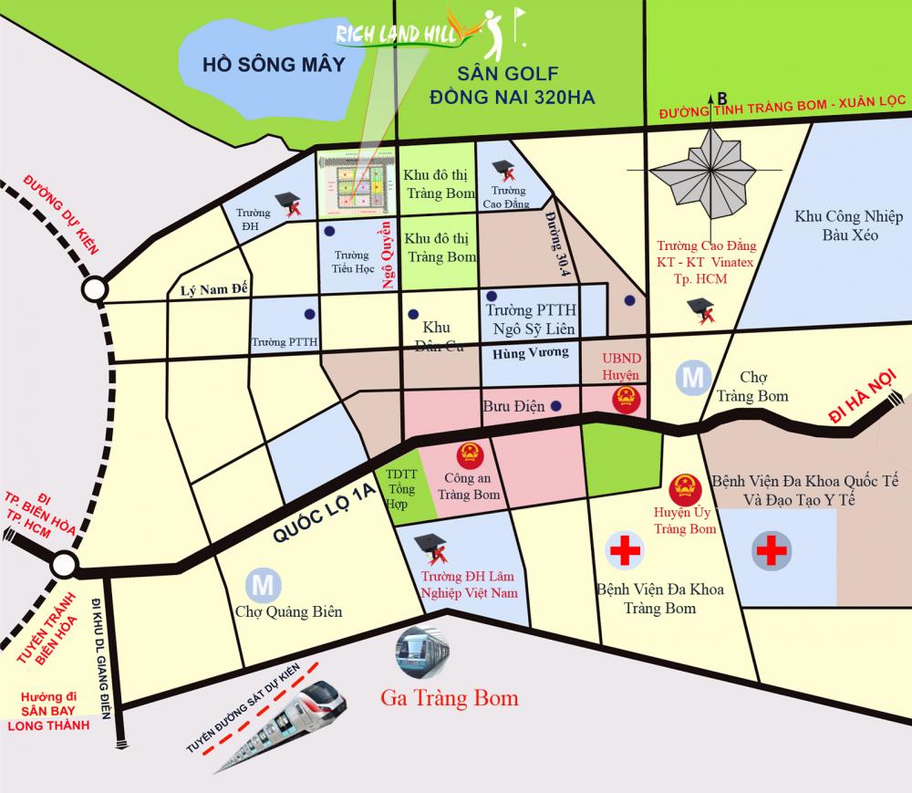 Dự án Richland Hill tọa lạc ngay khu đô thị hiện hữu thuộc thị trấn Trảng Bom, thuộc huyện Trảng Bom, tỉnh Đồng Nai, gầnsân golf Đồng Nai và hồ Sông Mây, gần khu hành chính, ngân hàng, trường học, chợ… Đây cũng là điểm giao của các tuyến giao thông huyết mạch như QL1A, đường sắt Bắc Nam, đường cao tốc TP Hồ Chí Minh - Long Thành - Dầu Giây, cao tốc Dầu Giây - Phan Thiết, Dầu Giây - Đà Lạt, tuyến đường vành đai 3,4, cách sân bay quốc tế Long Thành khoảng 10km....