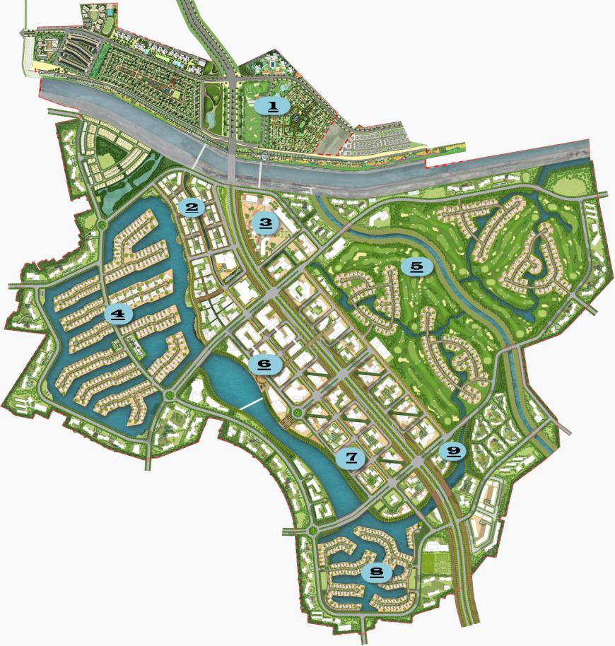 Theo quy hoạch chi tiết của đô thị với phân chia tỉ lệ sử dụng đất lý tưởng: 33,85% đất ở, đất thương mại chiếm 22,28%, đất xây xanh, mặt nước chiếm 21,86%, đất giao thông chiếm 17,13% và đất hành chính, công cộng chiếm 4,88% tổng diện tích.