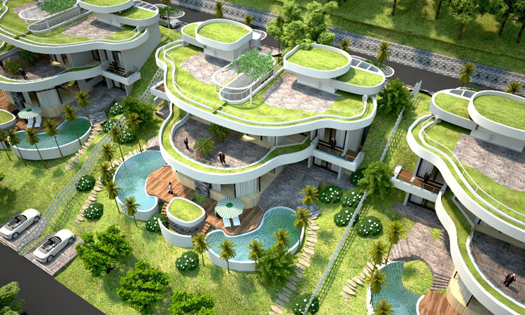 Các căn biệt thự ngà voi được quy hoạch tại 3 quả đồi vừa kín đáo vừa có tầm nhìn thoáng. Những căn biệt thự như những đám mây nhỏ vờn trên đỉnh đồi, lại vừa tạo nên ấn tượng về những nếp ruộng bậc thang uốn lượn khi tất cả mái biệt thự đều được phủ xanh bằng cỏ và các loại hoa.