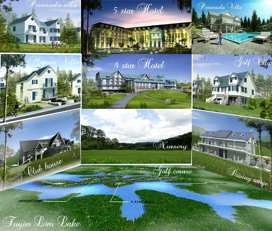- Biệt thự Resort: Khoảng 125 biệt thự bán đảo (Peninsula villa) và 45 biệt thự khu bến thuyền (Marina villa), mỗi biệt thự cao 2 - 2,5 tầng được bố trí thành tuyến hoặc cụm nằm trên các trục đường nội bộ, biệt thự được bố trí tùy theo địa hình thực tế khi triển khai, thể hiện được tính độc đáo, mới lạ và cao cấp. Biệt thự bố trí dọc theo mép hồ hoặc nằm trên các đồi thông tạo cảm giác thoải mái gần gũi với thiên nhiên và ngắm cảnh hồ. Các Biệt thự cao cấp khu Resort được chia làm các loại khác nhau, với quy mô và vị trí khác nhau và được bố trí thành các cụm mang tên của các loài hoa nổi tiếng của Đà Lạt như: Anh Đào, Mimoza, Hồng, Pencer, Lưu ly, Ti gôn… kèm theo số thứ tự trong cụm biệt thự, như Anh Đào 01, 02…. Trong mỗi cụm sẽ có hình thức kiến trúc riêng, mang tính đặc trưng để tránh tạo sự đơn điệu trong toàn khu.