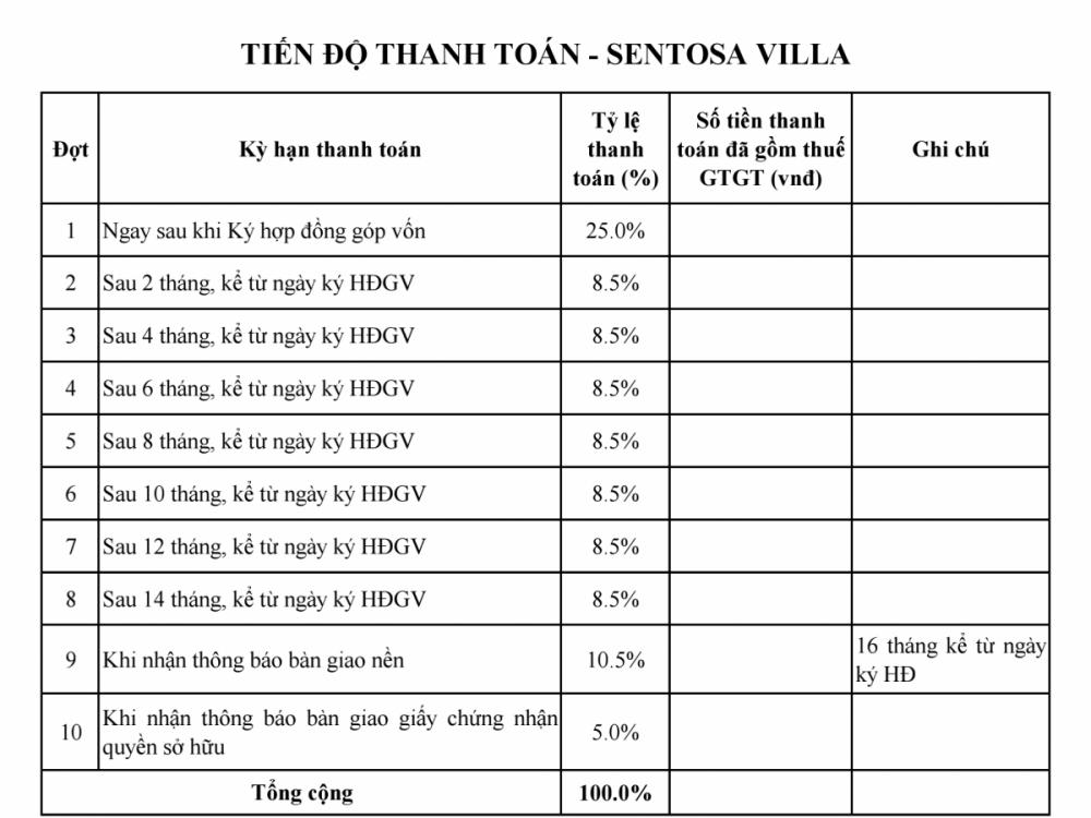 Lộ trình thanh toán Sentosa Villa