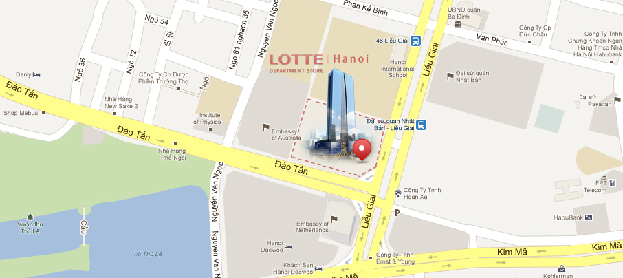 Lotte Center Hà Nội của Tập đoàn Lotte (Hàn Quốc) tọa lạc trên khu đất có vị trí khá đắc địa tại quận Ba Đình (Hà Nội) với 2 mặt đường Liễu Giai và Đào Tấn được coi là biểu tượng của Lotte Group Việt Nam và là tòa nhà cao thứ 2 sau Keangnam.