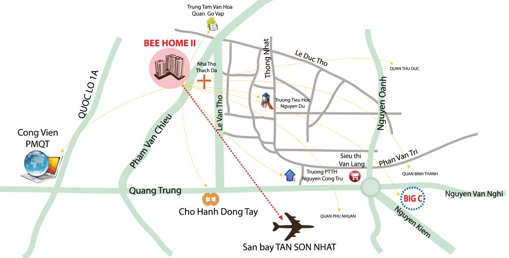 Căn hộ Bee home 2 thuộc khu dân cư hiện hữu ổn định, hệ thống giao thông thuận lợi, gần khu thương mại; phần mềm Quang Trung, Metro, Sân bay Tân Sơn Nhất, Siêu thị Big C, công viên Làng Hoa; trường đại học Hồng Bàng, cao đẳng Công nghiệp 4, THCS Nguyễn Du,… Từ đây Bạn dễ dàng đi về hướng Q.12, Củ Chi, hoặc về các tỉnh miền Đông như Bình Dương, Đồng Nai, hoặc về quận Tân Bình chỉ khoảng 20 phút.