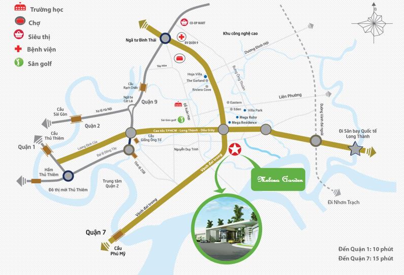 - Hướng từ quận 7: Từ cầu Phú Mỹ qua đường Vành Đai đến Melosa Garden với thời gian di chuyển từ Phú Mỹ Hưng tới dự án trung bình 15 phút.