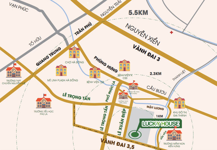 Không chỉ được đầu tư phát triển hệ thống tiện ích nội khu chất lượng phục vụ đời sống cư dân, Chung cư Lucky House còn có liên kết nhanh chóng tới hàng loạt tiện ích xung quanh nhờtọa lạc tại KĐTMậu Lương - một trong những khu vựctiềm năng nhất nhì quận Hà Đông vớihạ tầng phát triển đồng bộ:
